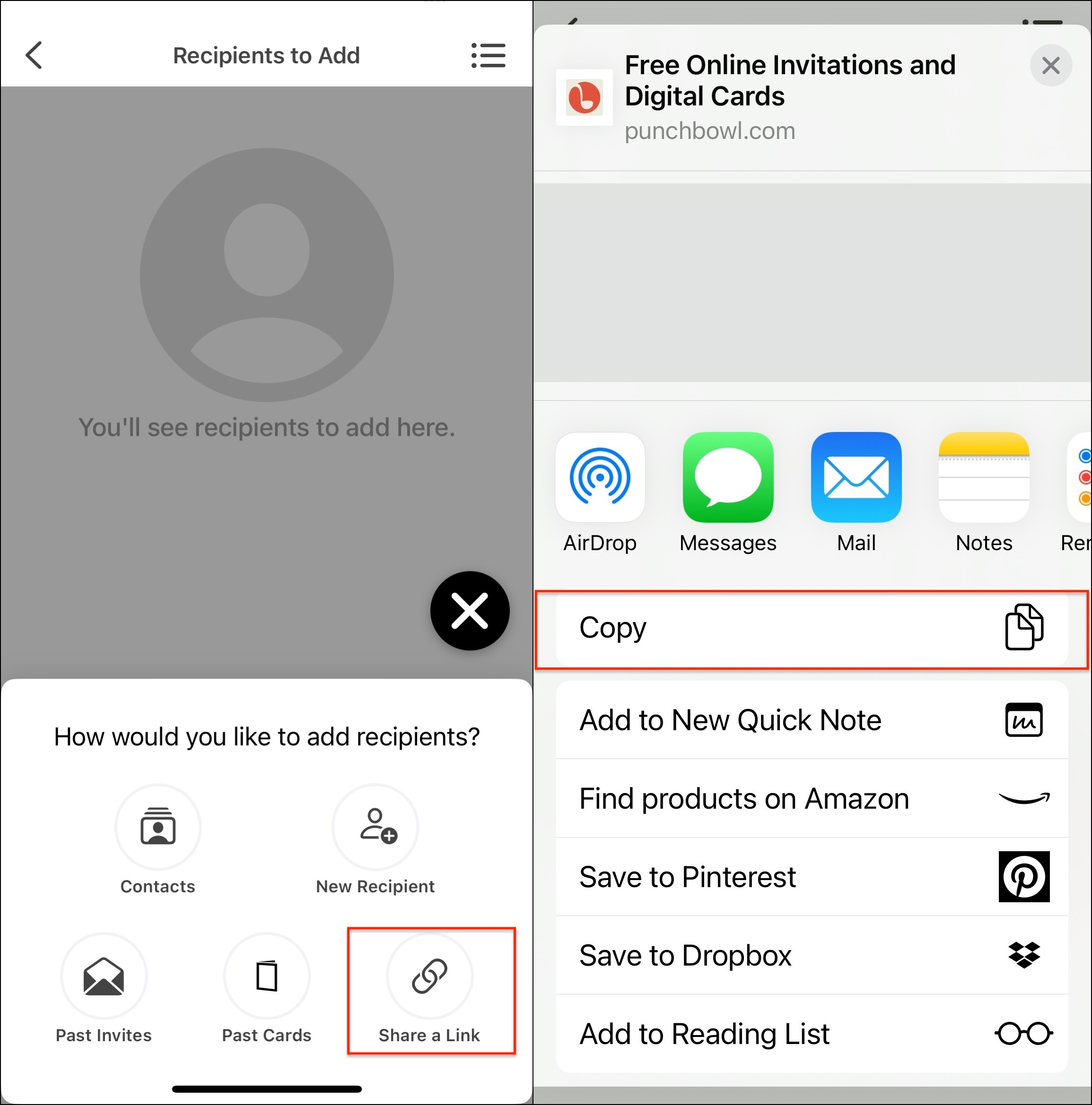At this time, Punchbowl can only send text messages to U.S. and Canadian phone numbers. If your recipient lives outside those regions, don’t worry—you can still share your digital greeting card with them by sending a direct link. Simply copy the link to your eCard and paste it into a text message, email, or messaging app. Learn more about how to share your card with a direct link here.