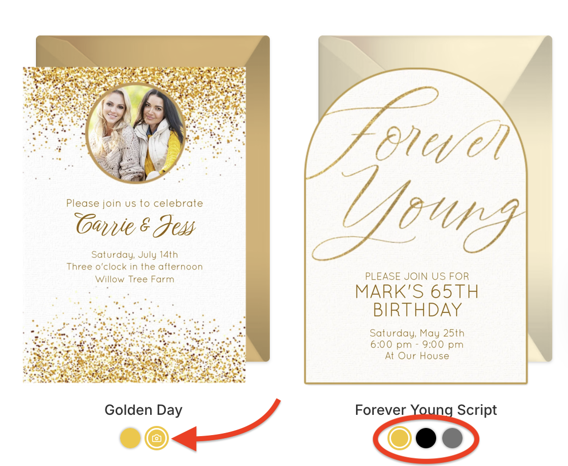 Want to change the color of your invitation? Tap on the Palette symbol when browsing designs to see available color choices.